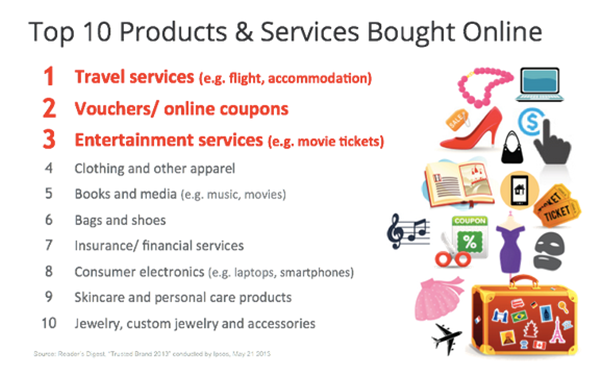 至于大马消费者的在线购物(online shopping)有何特别喜好?根据Insights by Google Malaysia的统计资料发现,消费者如预期的,旅游服务(机票、住宿)是排名第一,其次为电子优惠票券与娱乐服务(电影票)。