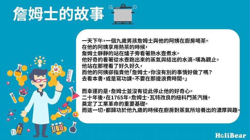 「一天下午,一個九歲男孩詹姆士與他的阿姨在廚房喝茶。在他的阿姨享用熱茶的時候,詹姆士靜靜的站在爐子旁,看著熱水壺煮水,他好奇的看著從水壺跑出來的蒸氣,與結出的水滴,嘆為觀止。他站在那裡看了好久好久,而他的阿姨卻指責他:〝詹姆士,你沒有別的事情好做了嗎?去看本書,或是寫功課。不要在那邊浪費時間。〞而幸運的是,詹姆士並沒有從此停止他的好奇心。二十年後,在1765年,詹姆士瓦特改良的紐科門蒸汽機,奠定了工業革命的重要基礎。而這一切,都要歸功於他九歲的時候在廚房對蒸氣所培養出的濃厚興趣。」