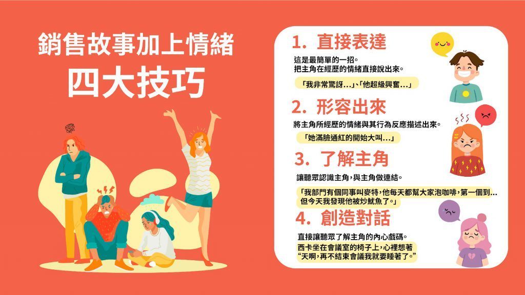 在你有了好的故事架構,加入了相應的情緒、細節與驚喜後,你已經成功了一大半。當然,在故事陳述的時候,不要忘了以下幾個小技巧: